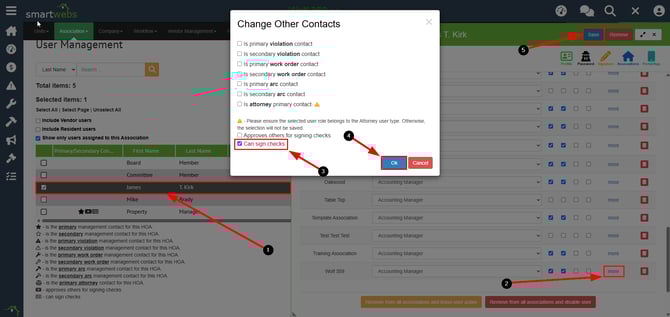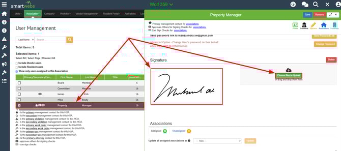 Once the users that want to approve invoices have a signature on file, you can mark them as check signers for certain associations. The only users who have access to do this would be those who are marked to "Approve others for signing checks", as indicated by the proper icon in the User Management section.