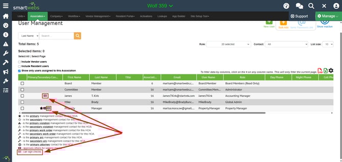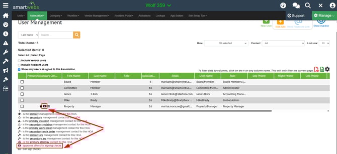 Any Check Signers for an association will be seen with the proper icon in the User Management section titled "Can sign checks".
