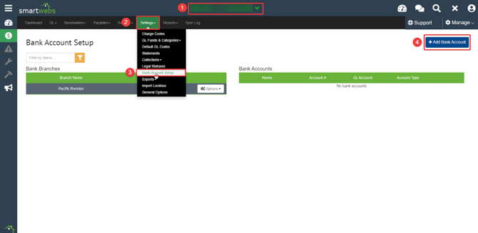 This guide provides an overview of the bank account setup feature in Smartwebs, available functionality, and steps to configure a new account