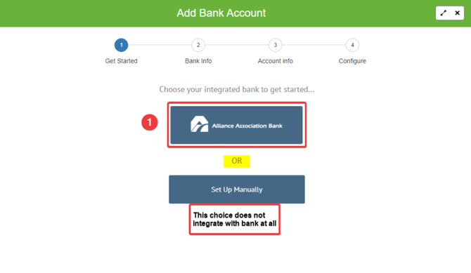 - Choose either the Integrated Bank tile or “Set Up Manually” If choosing “Set Up Manually”, Smartwebs Accounting will not interact with the bank at all