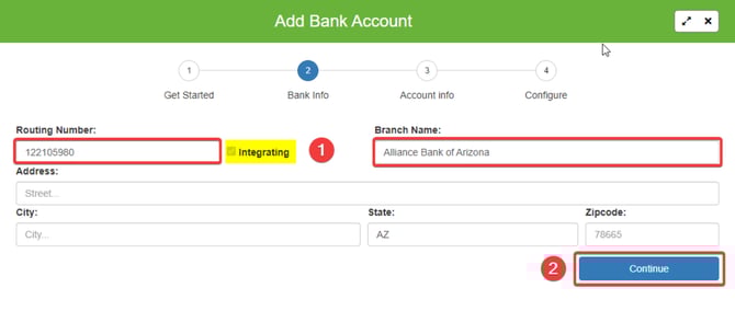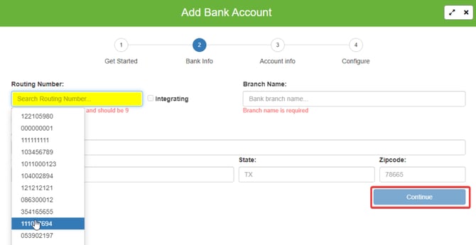 Note: If information is not prefilled, select the routing number from the drop-down menu under “Routing Number”. This will fill in the information stored in Smartwebs for that bank’s routing number. Review the information and click continue. - Enter Bank Account number