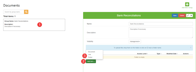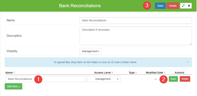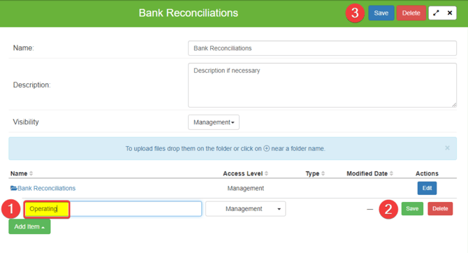 - Add Bank Account Folder; Click the + symbol to the right of the Reconciliations folder Note: VERY IMPORTANT: Bank Account Folder must have THE EXACT NAME as the bank account