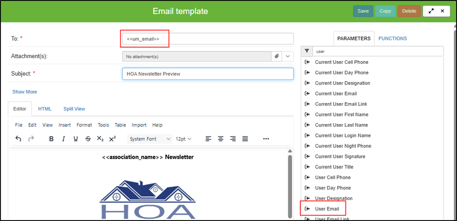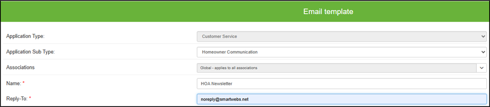 Enter subject line. Parameters may be used (example: Association Name).