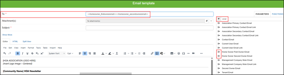 Use Parameters panel on right: - Filter by typing “email” or “cell” - Use arrow to insert merge fields