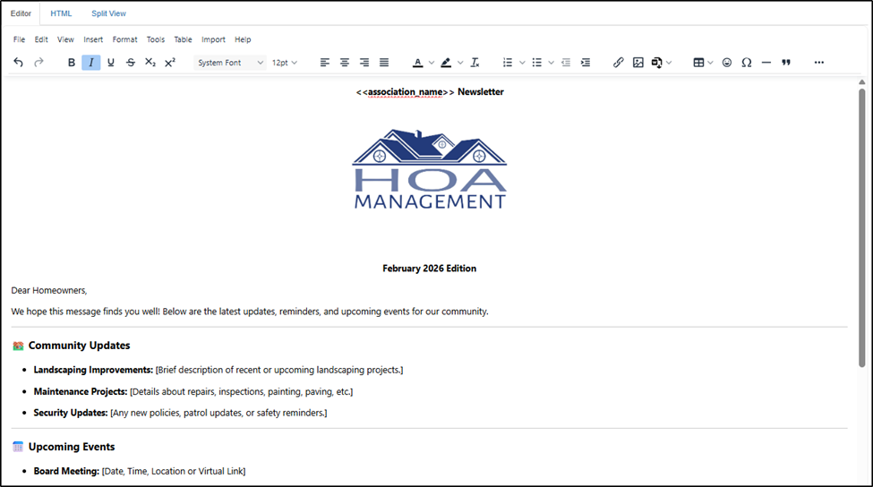 This User Guide provides step-by-step instructions for creating templates, drafting, scheduling, and sending bulk messages—known as campaigns—across multiple HOAs and Groups within Smartwebs. It includes guidance for users who create materials in Canva, explaining how to export content from Canva and import it into templates and campaigns in Smartwebs.