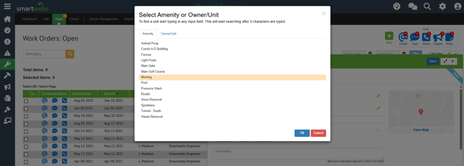 Choose whether the work order is for an Amenity (like a clubhouse or pool) or an Owner/Unit. After making your selection, click Ok.