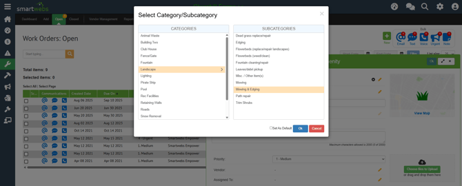 Select the appropriate Category and Subcategory for the work order, then click Ok.