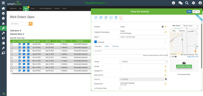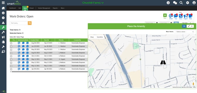 - Mapping: The map displays the location. You must map any floating amenities (light posts, fences) before saving. NOTE: Your device location must be on to map a work order.