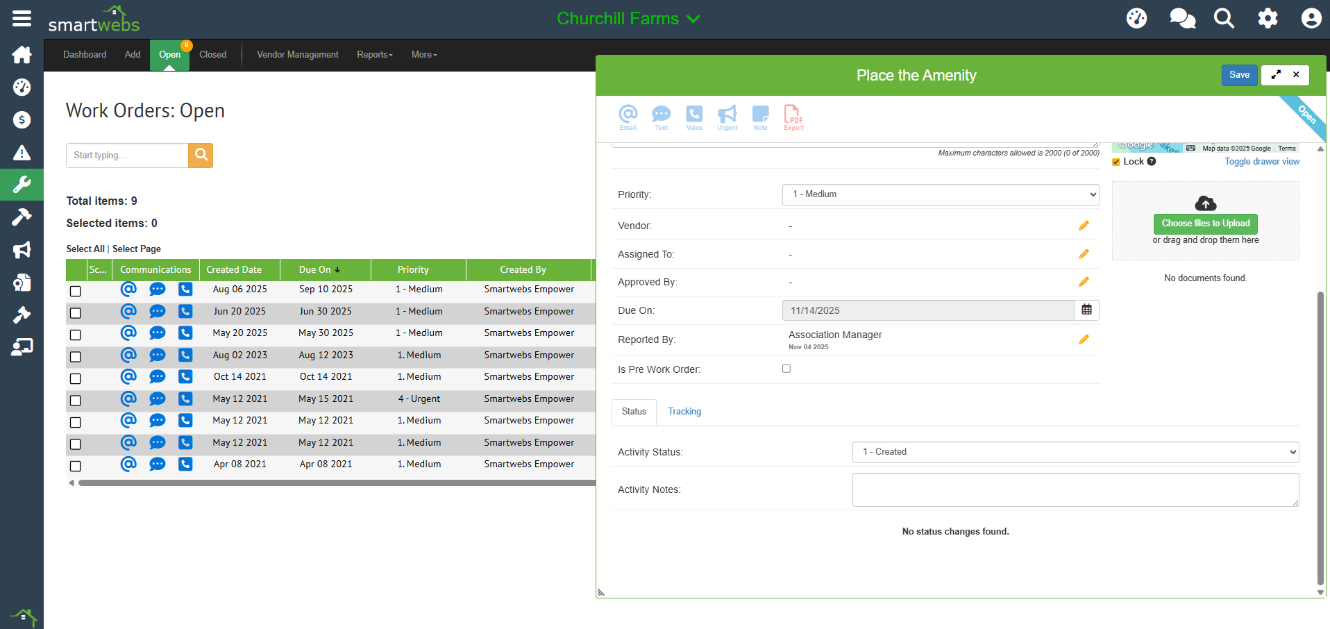 - Status: Update the work order's status and leave any activity notes. Status updates are tracked below the notes field.