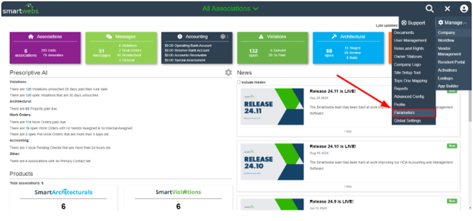 Select the gear icon in the top right of the screen > Manage > Company > Parameters