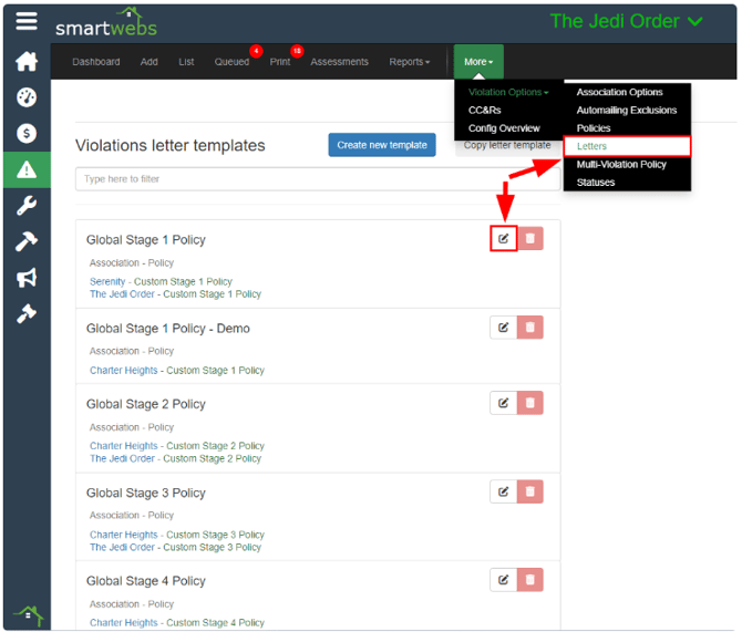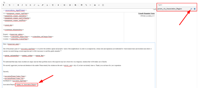 Navigate to Violations > More > Violation Options > Letters > Select the notepad icon for the template that you wish to edit and add the custom parameter in.