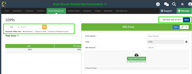 Navigate to Gear > Manage > Vendor Management > 1099s > 1099 Settings. Add the Year & Form. Select your preference for generating 1099s.