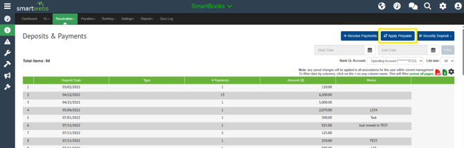 Run prepaids by navigating to Receivables > Deposits & Payments. Then click "Apply Prepaids".