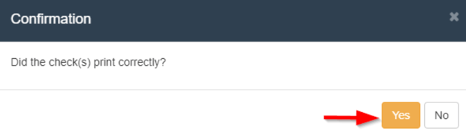 - A confirmation Pop-Up will ask if the checks printed correctly; Select the orange " Yes" button to confirm
