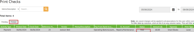 - The check will now show in the "Printed" tab instead of the "Pending" tab and will have a status of "Paid"