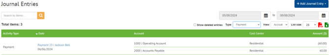 The Payment Journal Entry is now created. To view the Journal Entry: Navigate to Accounting > GL > Journal Entries. Here you will see the entry to debit the default Accounts Payable GL and credit the bank account GL.