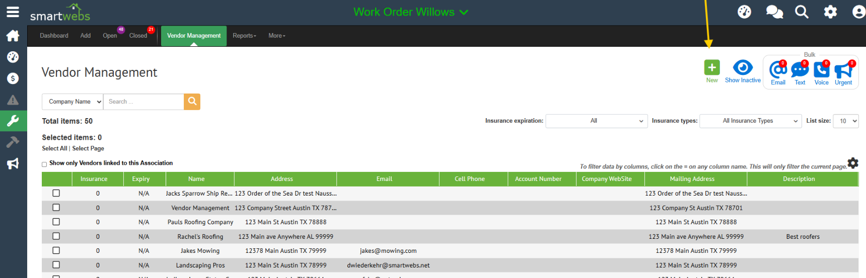 - On the Vendor Management page, click the green "New" icon located in the top right corner.
