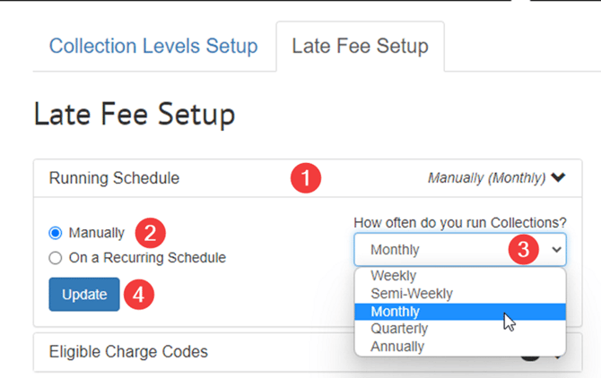 A: If your schedule is configured as Manual, you must run it when you want late fees assessed.