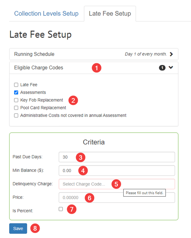 Ensure eligible charge codes align with the association’s governing documents and late fee policy.