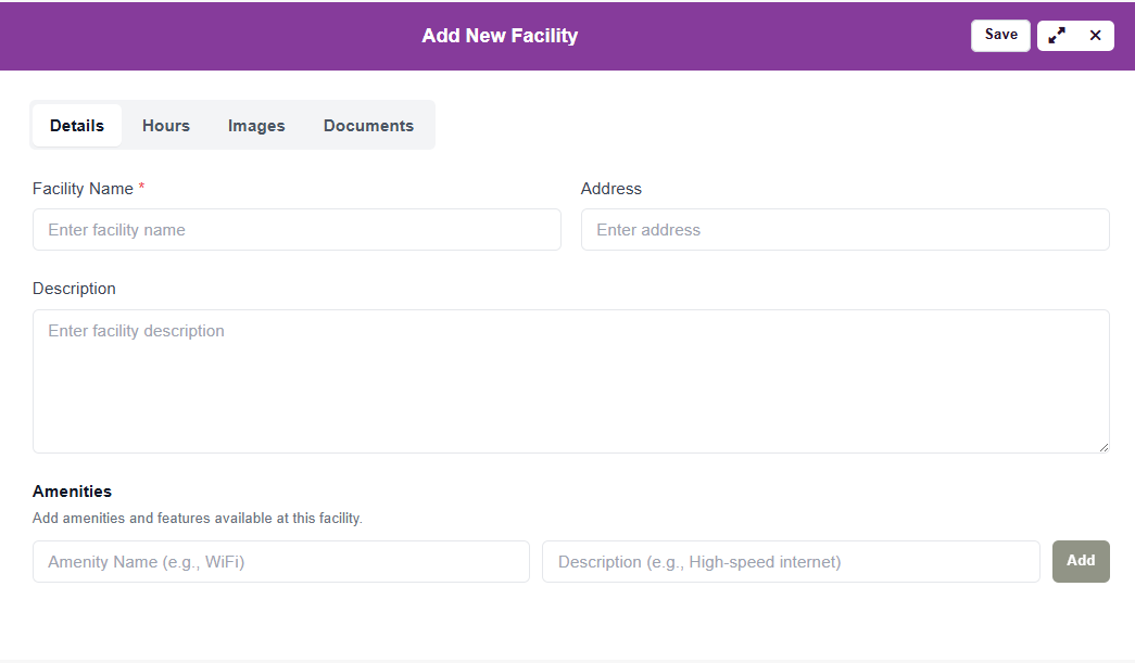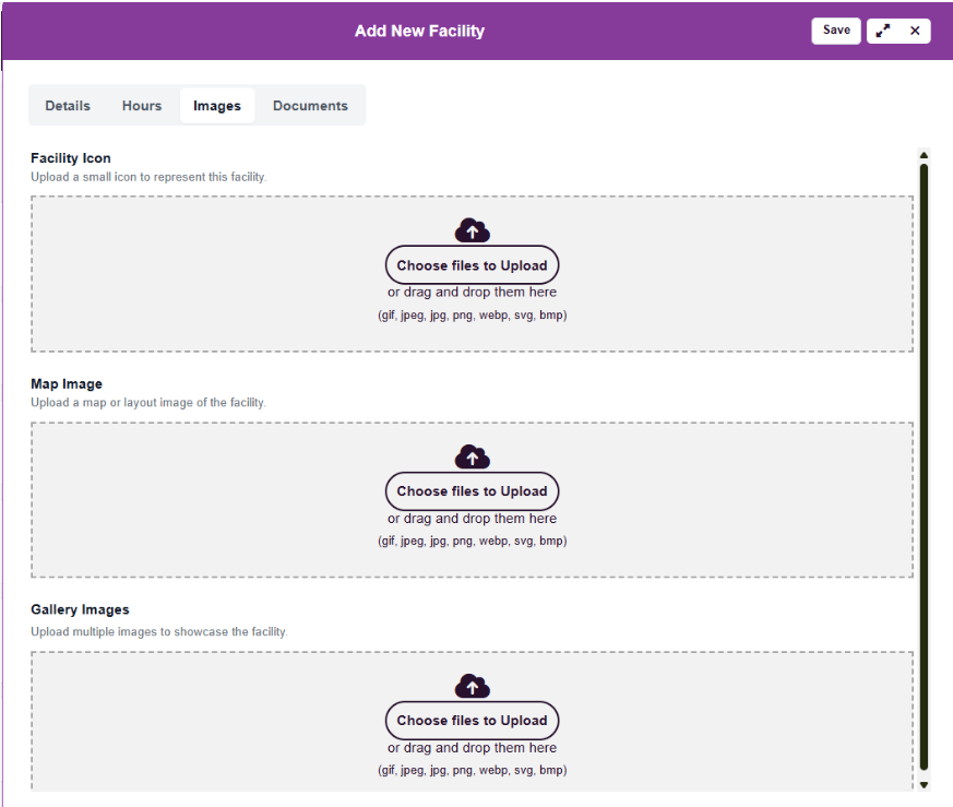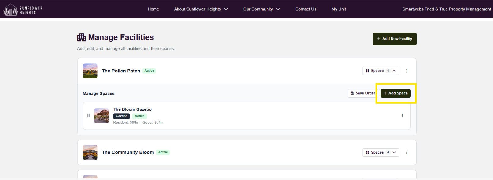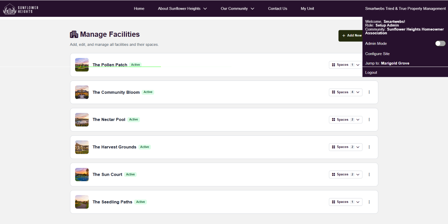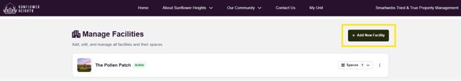 Facilities are the main locations where spaces exist (e.g., parks, clubhouses, courts). You will manage your facilites in the website (you will need to be logged into Smartwebs.)