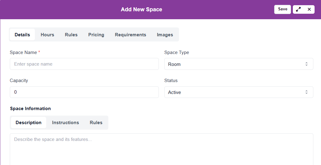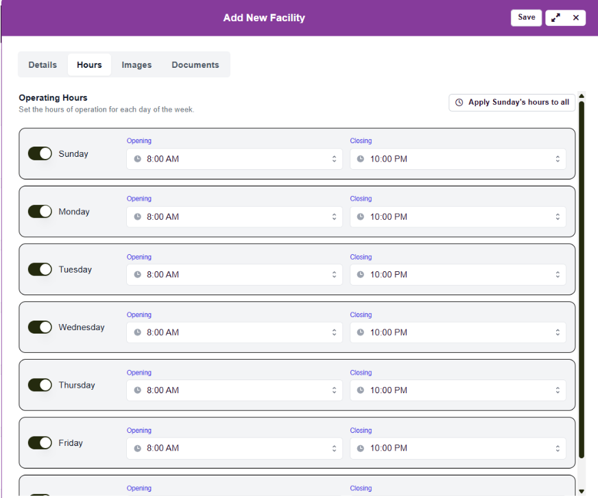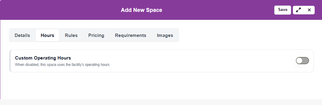 If the space follows facility hours, leave this disabled. Otherwise, define custom availability hours.