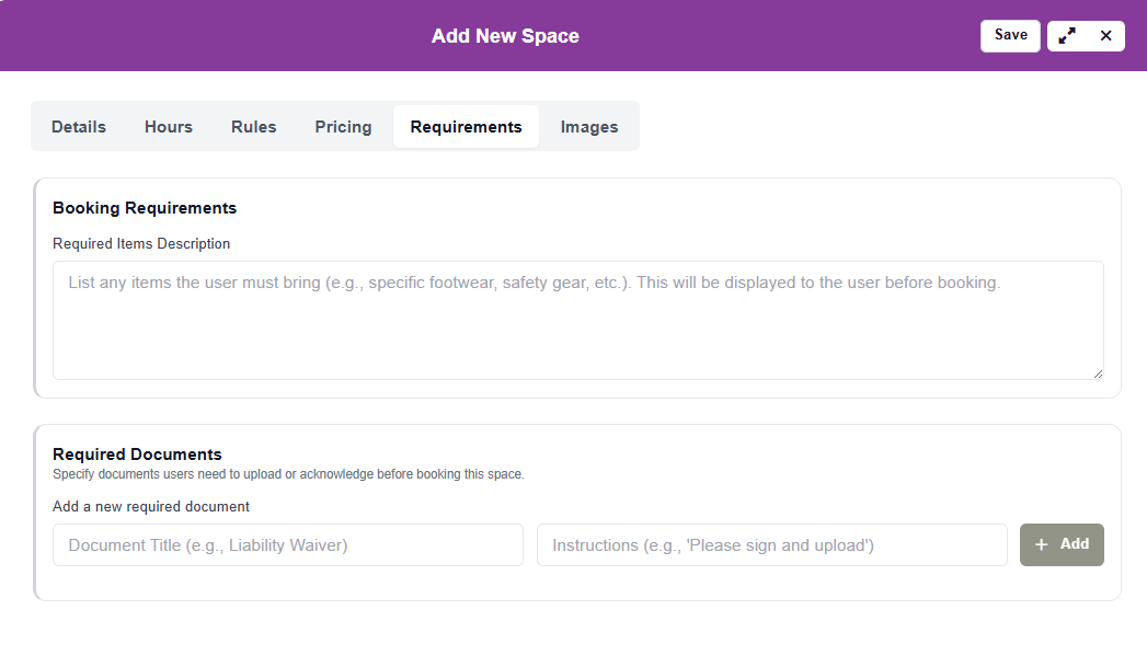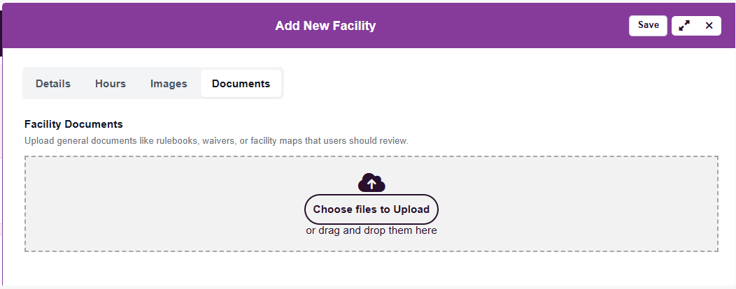 Upload Documents: Attach relevant files such as Waivers, Rules and regulations, Rental agreements