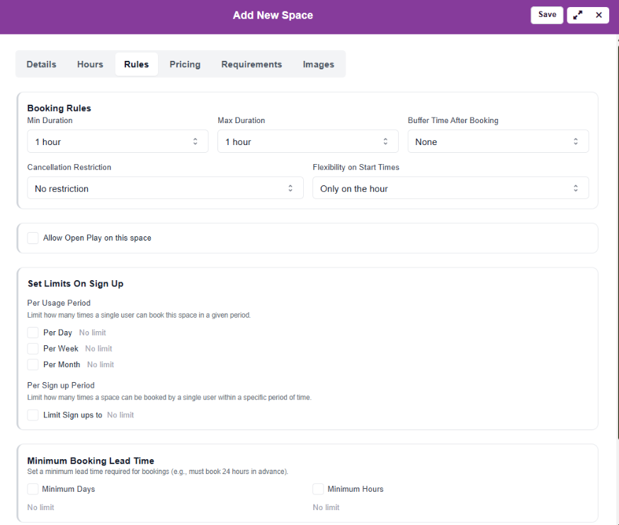 Minimum/Maximum Duration: Set how long a space can be reserved.