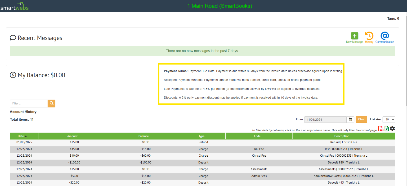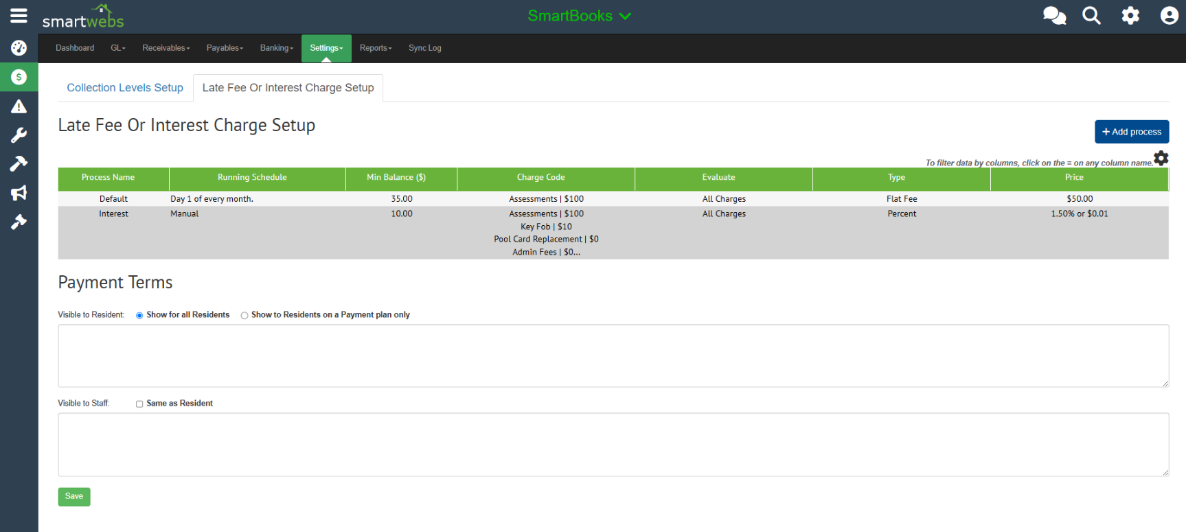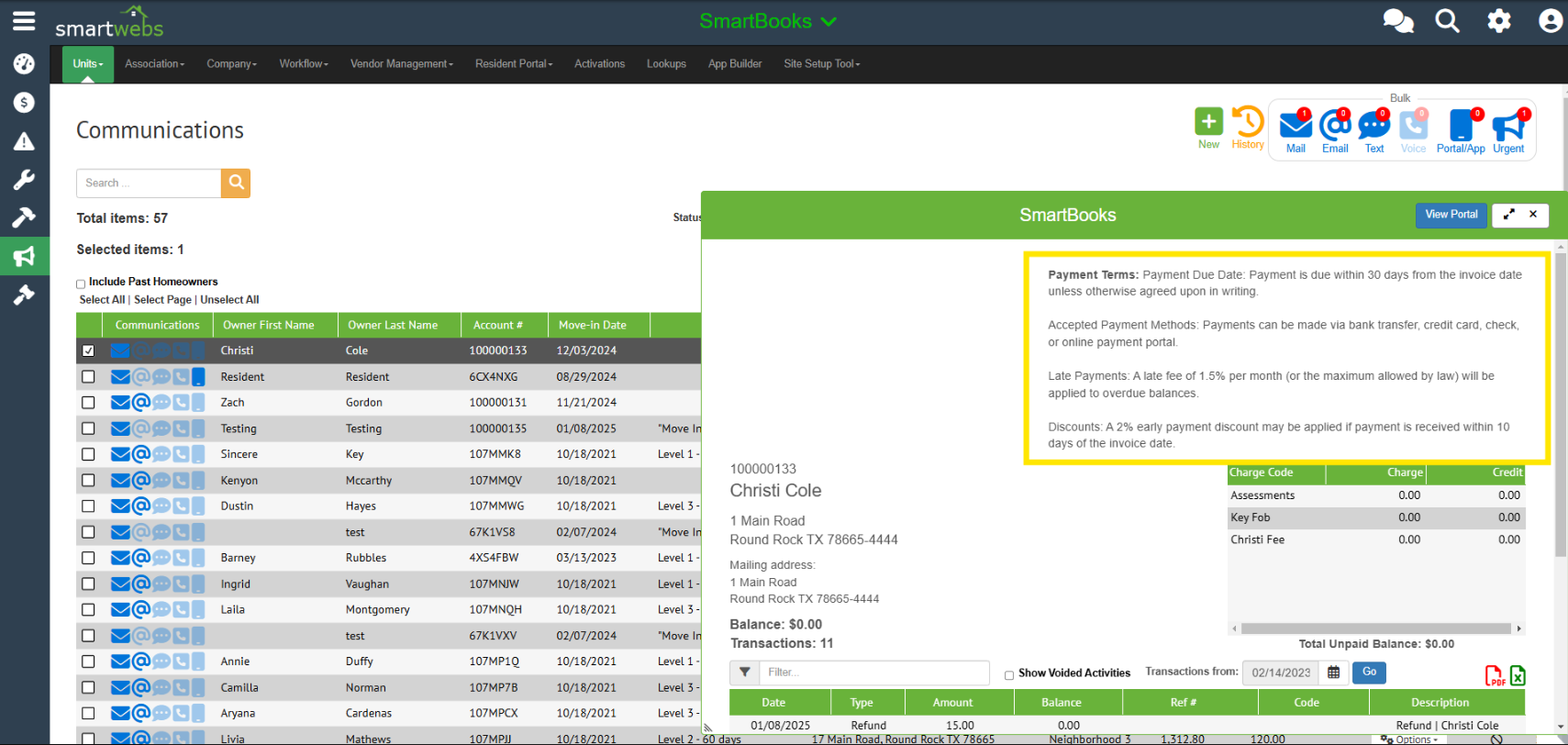 Once you configure your payment terms in the settings, you'll be able to make these visible to resident and staff via the resident portal and/or homeowner drawer.
